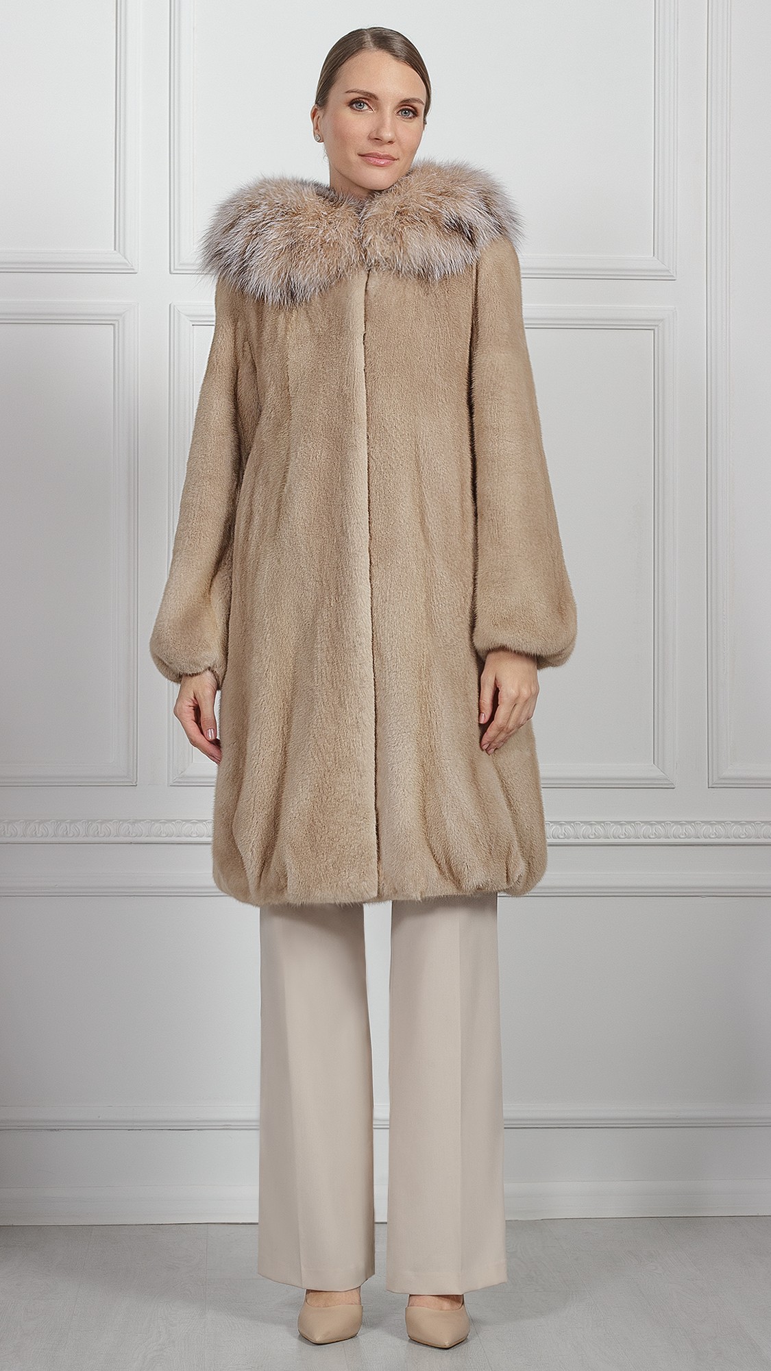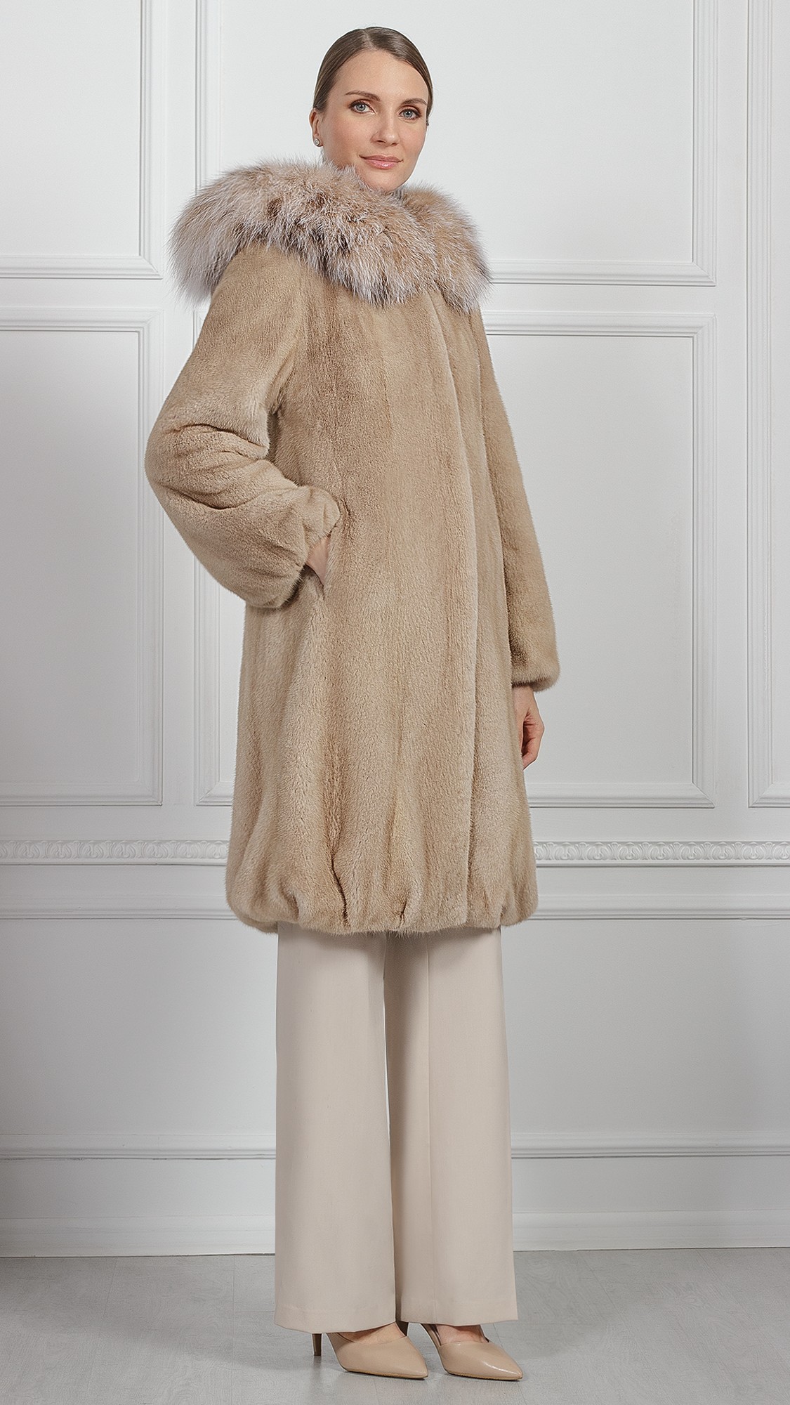 Шуба из меха норки, отделка рысь